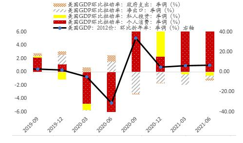 美联储主席鲍威尔表示,美国经济虽有改善但尚未全面复苏,美联储还没到收紧政策、特别是加息的时候。从图10可见,美国近半年GDP环比拉动率主要依靠消费端,下半年能否保持如此高的比率,主要看美国财政补贴是否继续发放。9月是美国延长的失业救济政策截至日期,在疫苗的大规模推广、疫情逐步稳定、财政支出面临债务上限的背景下,个人救助政策大概率将会终止,这将会驱动劳动力重回市场。若财政补贴个人的救助政策资金停止发放,待业人口回到工作岗位,很可能出现就业数据继续好转。那么下半年将出现就业数据好转,形成加息条件,抬升长端名义利率,并且伴随消费平稳趋弱带来的通胀预期向下,届时对黄金价格形成双重打压。