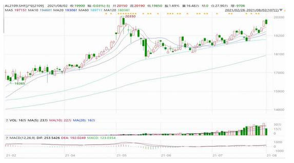 7月沪铝(20140, 280.00, 1.41%)价格走势呈震荡上行趋势,价格重心持续拉升。月初电解铝社会库存降幅持续收窄,且市场对消费转弱有较强预期,铝价低位震荡。月中消费并未表现出明显转弱迹象,库存持续下滑,铝价略有回升。月末随着美联储7月利率会议决议偏鸽,美元指数跳水,商品价格普遍反弹。消息面再传出云南地区电解铝企业受限电影响面临减产,市场对未来供应偏紧预期有所上升,铝价大幅拉涨,突破2万元/吨压力位。截至7月末,沪铝月涨幅6.69%
