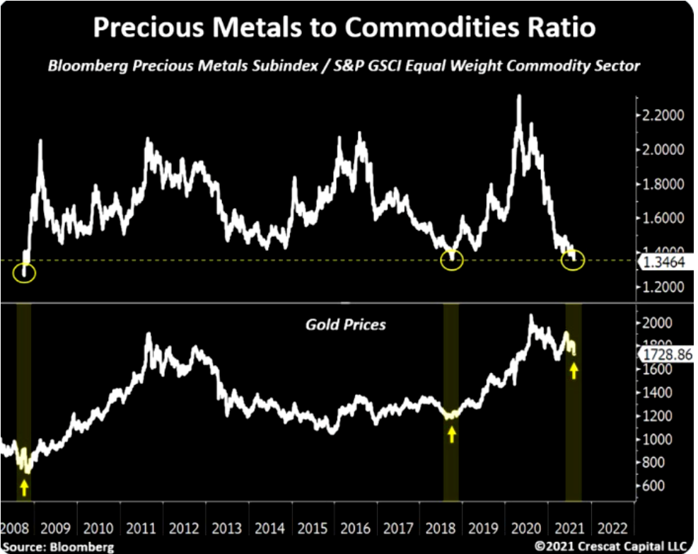 疫情以来,全球各国货币与财政双双发力,使得贵金属与一般大宗商品价格均大幅走高。但在疫情初期,贵金属明显上涨更快,使得这一比值快速冲高。而当下,经济复苏提振大宗商品需求,大宗商品价格仍在高位,而美联储已着手准备缩减购债,宽松政策已处在退出边缘,贵金属价格回落,这一比值走低也不足为奇了。