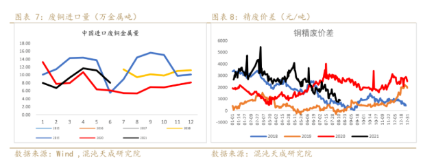 供给端,矿端的干扰仍在,废铜供应偏紧。智利铜矿Caserones工会计划罢工,智利Andina铜矿工人们拒绝了最新的合同,投票决定罢工。Escondida铜矿的工人同意签署一份新合约,罢工避免。但后续仍有密集的劳资合同到期,仍有潜在罢工威胁增多的可能;疫情影响,废铜制杆产能扩张,废铜的供给阶段偏近,精废价差回落。