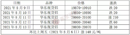 华东地区:美参议院通过万亿基建法案,宏观消息面利好,加上因限电等原因,供应端收紧支撑下,市场信心受到鼓舞,铝价再次攀上2万关口,截止本周五,华东现货铝价格在20030-20070元/吨之间,环比上周五上涨140元,现货贴水30元/吨。市场成交方面,本周市场货源充裕,无锡地区到货量增加,库存小幅积累;下游企业因淡季影响,多逢低按需买入为主,整体市场成交一般。