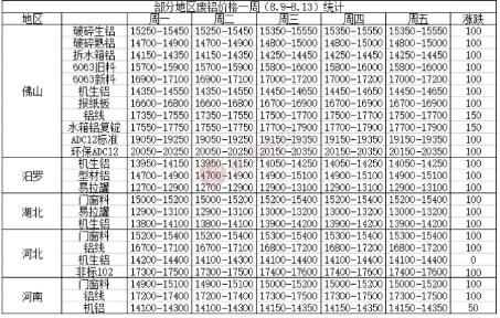喷涂旧料主流价格15100附近,断桥13900附近,铝线1.76万附近,易拉罐主流1.32万附近,压扁价格加价,1系废铝仍在长江铝85-86折左右。