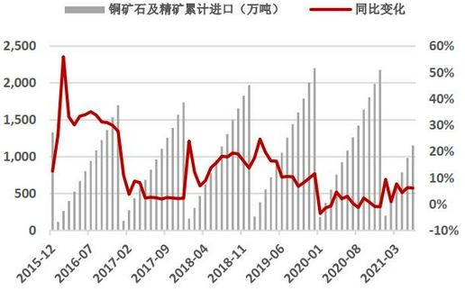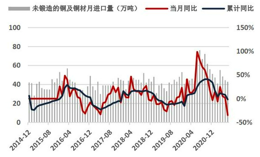 图5:未锻造铜及铜材进口累计值(单位:万吨)
