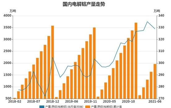 电解铝产量方面,SMM数据显示,2021年6月(30天)中国电解铝产量321.7万吨,同比增长7.1%,日均产量10.7万吨,环比小增0.03万吨;2021年上半年中国共生产1946.8万吨,累计同比增长8.10%。6月份仍是增减产并行,云南省内电解铝复产进度缓慢,甘肃、河南的电解铝复产产能逐步放量,同时月内贵州地区个别铝厂出现小幅减产。截至7月初,中国电解铝运行产能3888.0万吨/年,有效建成产能4380.4万吨/年,全国电解铝企业开工率88.8%。SMM调研6月铝水占比68.5%,环比基本持平。