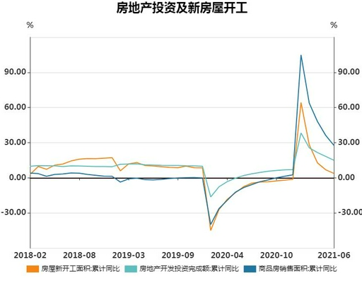统计局数据显示,2021年1-6月房地产销售面积、投资额、新开工面积分别为88635万平方米、72179亿元、101288万平方米,同比增速分别为+27.7%、+15.0%、+3.8%,前值分别为+36.3%、+18.3%、+6.9%。从数据上看,销售面积、新开工面积增速均有较大幅度回落,整体动能明显不足。由于基数、新开工面积减少等原因,房地产开发投资额也出现下滑,后续需要关注的是房地产监管政策对房地产市场的影响。目前,100大中城市供应土地面积已经出现了明显下滑。下半年如果监管继续收紧,房企拿地和新开工可能会受到进一步影响,房地产开发同比增速或将继续下滑。