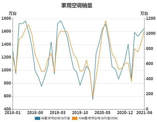 国家统计局数据显示,6月空调销量为1650万台,同比减少3.9%。内销1036万台,同比下滑11.6%(略超2019年同期),环比5月增加2.9%。外销615万台,同比增加12.8%。6月,空调内销需求环比好转,由于5月全国气温偏低,且618促销导致5月部分需求延后到6月,使得6月空调零售需求好于5月。而外销则是持续受到欧美需求带动,景气度持续,上半年累计出货同比增长15.3%。