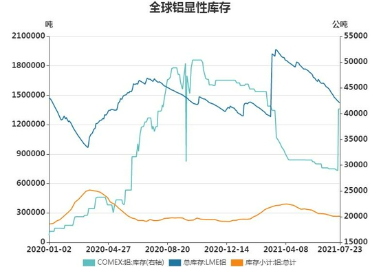 截至7月23日,全球铝显性库存报1731091吨,较6月末减少183574吨,其中COMEX铝库存40900吨,较6月末增加11426吨;LME铝库存1423525吨,较6月减少154550吨,6月份伦铝库存录得较大幅度下降;上期所铝库存266666吨,较6月末减少62906吨。整体来看,全球铝显性库存出现大幅下降,伦铝库存出现较大幅度减少。伦铝库存在3月底以来持续回落,下降幅度超过预期。国内去库态势表现尚可,库存总体处较低水平。当前国内铝市尚未正式进入累库,去库仍延续未停止,预计仍将持续一段时间。
