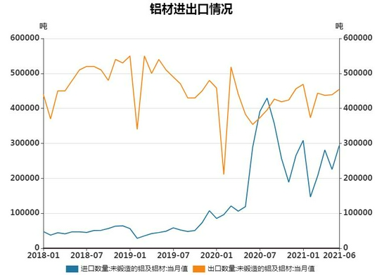 据海关总署统计:2021年6月未锻轧的铝合金进口量为294081吨,吨,环比增加30.43%,同比增长1.83%;1-6月份未锻造铝及铝材进口累计146.2761万吨,同比增加79.12%。而中国6月份的未锻轧铝及铝材出口为45.43万吨,环比增加3.48%,同比增加28.34%。今年1-6月中国未锻轧铝及铝材累计出口261.61万吨,同比增加10.57%。6月以来沪伦比值有所升高,内外铝价出现倒挂,进口窗口打开,导致铝材进口环比有所增长,预计下半年铝材进口的情况仍将持续。