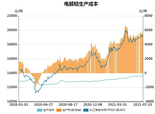 粗略估计,吨铝需要约1.93吨氧化铝,13500度电,以及0.48吨预焙阳极、0.02吨氟化铝、0.01吨冰晶石等,人工及折旧等财务费用平均为2000元/吨。截至7月28日,合计生产一吨电解铝的较低成本约为13592元/吨,成本较6月末增加54元/吨,电解铝生产利润5937元/吨,环比6月末增增加718元/吨。长江有色A00铝均价报19360元/吨,环比6月上涨600元/吨.氧化铝价格方面,贵州一级氧化铝均价报2425元/吨,环比6月上涨10元/吨。预焙阳极价格方面,西北地区的预焙阳极报价4825元/吨,环比6月末上涨75元/吨。冰晶石报价6000元/吨,环比6月末持平。干法氟化铝报价7450元/吨,环比6月末下跌50元/吨。此外,电解铝成本占比最大的电力方面,预计我国电解铝平均电价为0.325元/度,在我国碳排放费+严监管的背景下,自备电厂优势或将削弱,而成本更低的水电的使用比例将逐渐增加,进而导致电解铝平均电价逐渐下降。