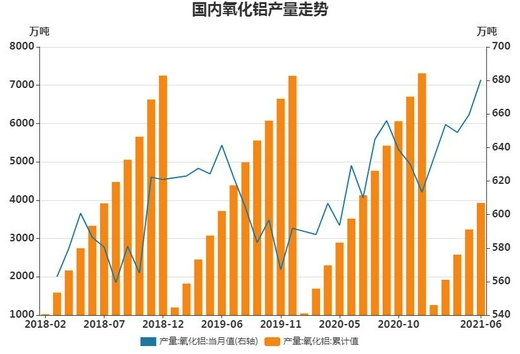 氧化铝方面,SMM数据显示,2021年6月(30天)中国氧化铝产量611.5万吨,其中冶金级氧化铝产量590.5万吨,冶金级日均产量19.7万吨,环比转降1.7%,同比增长7.4%;2021年上半年中国共生产冶金级氧化铝3533.3万吨,累计同比增长8.3%。本月受制于河南、山西矿石紧缺及全国煤炭价格普涨等原因,北方地区运行产能环比前一月小降;西南地区产能则是环比续增,广铝、崇左龙州项目均贡献增量。需求端看,6月中国电解铝产量321.7万吨,估算月内氧化铝净进口在30万吨水平,月内小幅过剩1.2万吨。截至7月上旬,中国冶金级氧化铝运行产能7167万吨/年,建成产能增至8860万吨/年。本月西南地区新增放量持续,河南雨情对氧化铝厂影响相对有限,需持续关注北方各省氧化铝厂运行波动,党庆之后国产矿石供给料宽松,但煤价上涨带来的成本端压力不容小觑。