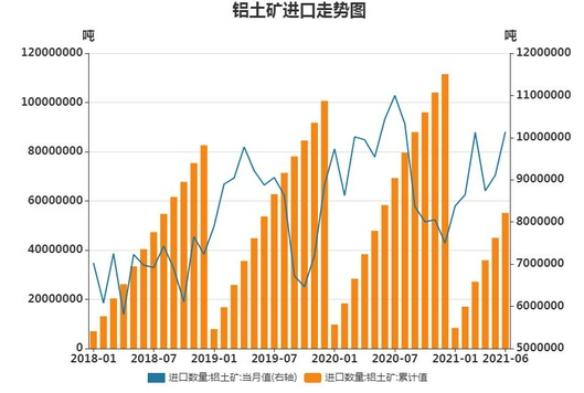中国铝土矿虽然分布集中,大中型矿床较多,但不易开采,不像国外那些适合露天开采的红土型铝土矿,目前我国铝土矿对外依存度约60%。根据海关统计数据显示,2021年6月中国进口铝土矿数量1013.98万吨,比5月增加11.27%,上半年累计进口量5512.72万吨,同比上半年减少5%。6月份的进口国中,几内亚进口量环比6月增加0.96%。澳大利亚和印尼的增幅较大,但同比去年6月仍有减少。
