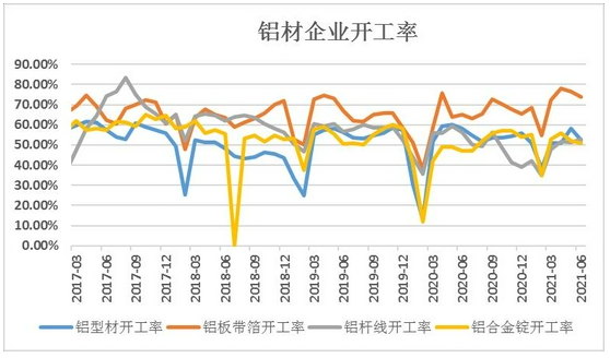 铝合金方面,我国多年来一直是铝合金的生产大国和净出口国,但出口基数较低,对铝价影响有限。铝材方面,根据中国国家统计局的数据,2021年1-6月,我国铝材累计产量2965万吨,同比增长14.9%;6月份铝材企业开工方面,其中铝型材企业开工率52.61%,环比减少5.38个百分点,较2020年同期减少5.65个百分点;铝板带箔企业开工率73.77%,环比减少2.91个百分点,较2020年同期增加8.57个百分点;再生铝合金锭企业开工率51.00%,环比减少1.92个百分点,同比增加8.51个百分点。铝杆线企业开工率52.8%,环比增加3个百分点,同比减少6个百分点。近月以来,铝价整体处较高区间,市场对加工费上涨接受度低,部分中小型企业暂缓接单生产。此外,后市铝市逐渐步入需求淡季,预计后市整体开工率环比将持续小幅走弱。