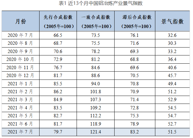 据模型监测结果显示,2021年7月份,中国铝冶炼产业景气指数为51.5,较上月回落1.2个点,处于“正常”区间上部;先行合成指数为79.7,较上月回落2.0个点,降幅扩大1个点。近13个月中国铝冶炼产业景气指数见表1。