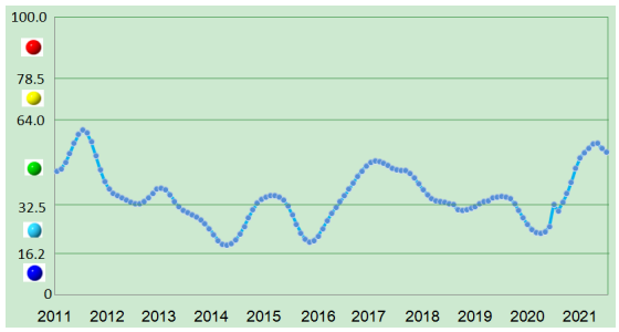 2021年7月份,中国铝冶炼产业景气指数回落1.2点至51.5,是继5月份达到年内高点以来出现回落的第2个月份,降幅较6月份有所收窄,仍处于“正常”区间中上部。中国铝冶炼产业月度景气指数走势见图1。