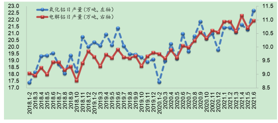一是影响供给事件频出,区域性生产受限为。今年二季度以来,内蒙等地为确保完成能耗双控目标,电解铝运行产能部分停产、新建产能暂缓投放;云南、广西等地电力供应紧张,其中云南电解铝生产用电降负荷比例一再提升,7月中下旬从20%增至30%,广西也限电省区新建能力投产计划再度延期;加之,河南暴雨迫使部分企业紧急断电停产,当地电解铝、氧化铝、铝加工及再生铝企业生产经营受到不同程度影响,以上区域性供给端受限导致全国累计减停产电解铝产能超过120万吨。截至7月末,全国电解铝运行产能在3860万吨/年左右,6月份,全国电解铝产量329万吨,较5月份的332万吨下降了0.9%,连续两个月回落。受北方煤炭及铝土矿供应以及河南暴雨影响,北方地区氧化铝生产受到影响,截至7月末,全国氧化铝运行产能7300万吨/年左右,6月份产量680万吨,较5月份的660万吨增长了3.2%。铝冶炼产品月度日均产量见图3。