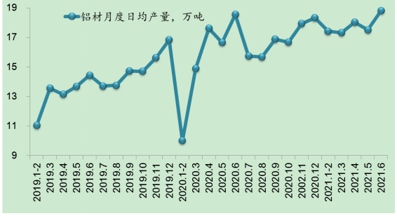二是消费进入传统淡季,但总体表现好于预期。国家统计局基于中国采购经理指数等宏观指标判断,今年7月份我国经济继续保持扩张态势,但步伐有所放缓。特别是局部地区高温洪涝灾害等极端天气影响,制造业扩张力度较上月有所减弱,但大多数行业仍处于景气区间。今年上半年,全国基础设施投资同比增长7.8%,两年平均增长2.4%,比前5个月下降0.2个百分点;全国电网工程完成投资1734亿元,同比增长4.7%。6月份汽车产销继续回落,环比分别下降4.8%和5.3%,同比分别下降16.5%和12.4%。但新能源汽车产销持续保持高速增长,6月份市场渗透率继续提升,达到12.8%。鉴于芯片供给不足影响犹存,预计7月份汽车产销仍维持上月表现,产品结构性调整继续。此外,光伏装机的加速建设也持续为铝消费增长增添新动能。