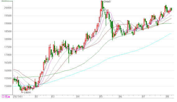四是铝价维持高位,行业效益向好。今年7月份,沪铝价格维持在18500至19500元/吨间波动,月均价19185元/吨,较6月份均价18590元/吨上涨3.2%;氧化铝均价2491元/吨,同比增长2.5%。沪铝主力合约价格走势情况见图5。在价格上涨的同时,能源及原辅材料等成本要素价格也有所上涨,但涨幅不及价格波动。今年前6个月,铝冶炼行业主营业务收入4257亿元,同比增长33.3%,主营成本3465亿元,同比增长18.5%,行业实现利润544亿元,同比增长700%。