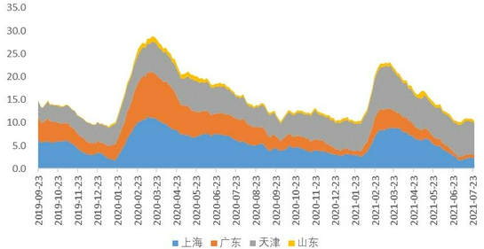 库存方面来看,截至7月23日,LME锌库存为247300吨,较6月下降11300吨,海外库存继续维持去库状态,但去库幅度弱于上月。7月虽然Delta变异病毒仍在多国肆虐,但在疫苗接种规模持续扩大的情况下,海外国家仍在放松防疫政策。伴随欧美消费能力的不断释放,海外市场的需求水平继续回升。不过受国内终端需求季节性转弱影响,海外货源仍难以通过进口的形式流入国内市场。