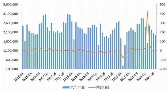 从汽车产量来看,6月份汽车产量为194.3万辆,同比增长-16.51%。受去年下半年汽车行业的高基数效应影响,6月汽车产销同比呈回落态势,并且跌幅扩大至两位数。除去年低基数效应消失以外,在国内高温以及多地分散疫情的影响下,汽车市场也逐渐进入季节性淡季。虽然芯片供应短缺、原材料价格上涨等因素对汽车市场造成的影响仍未散去,但随着国内经济的持续平稳恢复,叠加促消费政策措施的不断发力,后续汽车产销仍有望实现正增长,汽车用锌消费的增长空间也具有潜在基础。