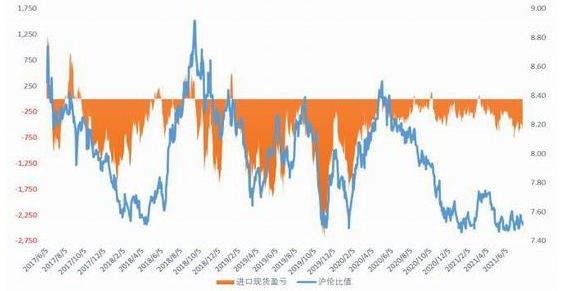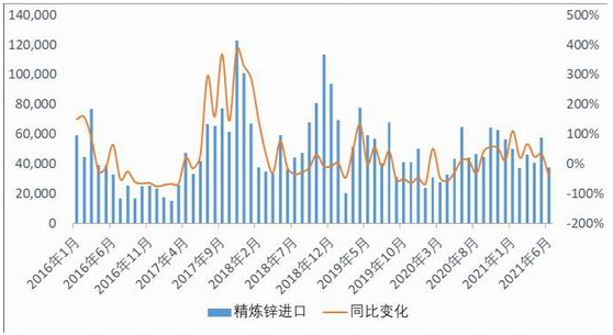 海关总署最新数据显示,2021年6月进口精炼锌3.75万吨,环比下降34.77%,同比下降42.05%,合计出口精炼锌0.05万吨,2021年6月净进口3.69万吨。2021年1-6月累计进口26.9万吨,同比上涨20.79%。6月的美联储议息会议首次释放鹰派信号,基于美国国内通胀及就业数据的上行,市场预期美联储将提前对货币政策作出调整,受此预期影响,美元开始筑底回升,大宗商品价格集体回落。目前LME锌库存仍维持去库状态,绝对库存量的持续下降也暗示海外消费处在复苏之中,并且LME0-3正向结构也一度收窄至贴水11美元/吨。国内方面,云南地区锌冶炼厂复产较此前预期提前,虽然受7月中旬的限电政策影响,产能规模再度压缩。但整体的产量释放较二季度更为顺畅,同时国家粮食和物资储备局也已投放第一批锌锭储备,第二批翻倍抛储也已在路上。不过当前国内库存仍处在绝对历史低位,对现货升水有一定的支撑,但进口窗口还是没有修复至打开。因此在进口窗口长期关闭的情况下,锌锭进口量主要是靠外贸长单支撑,预计后续精炼锌进口量将继续维持在3-4万吨的水平。