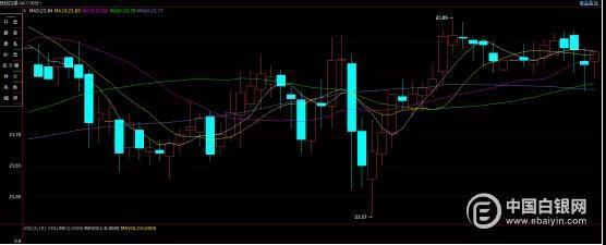 周三国际现货白银亚市早盘开于23.82美元/盎司,日内最高上探23.89美元/盎司,最低录得23.56美元/盎司,最终收于23.82美元/盎司,日内下跌0.02美元/盎司,日跌幅0.08%。