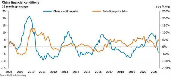中国经济放缓正在拖累钯金价格。投资、工业活动和国内消费的月度指标显示,7月份的增长回落速度快于预期。作为衡量消费支出的指标,零售额增长从6月份的12.1%放缓至8.5%,远低于预期(来源:中国国家统计局)。中国的信贷冲量也有所减弱,这表明基础设施和设备投资放缓,通常标志着经济活动的转折点。从历史上看,中国信贷需求下滑之后,钯金价格就会比去年同期下降。