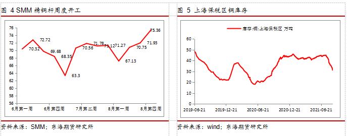 库存方面,国内维持降势,8月以来,上期所库存下降超11万吨,截止8月27日,报8.24万吨;上海保税区库存去库10万吨,报31.2万吨;国内社会库存也去库超2万吨,报13万吨,淡季不淡效应明显。LME铜库存报25.4万吨,虽然仍处累库进程之中,但是近期LME注销仓单持续攀升至10万吨,注销仓单占比达39%。随着国内现货持续紧张,LME库存可能转运至国内,预计LME累库或放缓甚至终结。