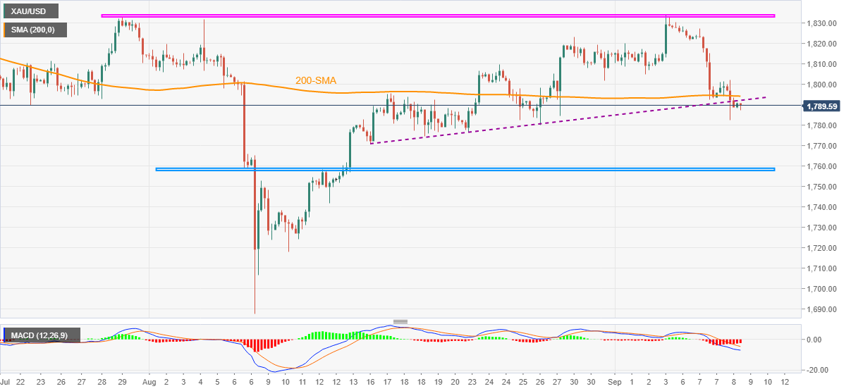 FX168财经报社(香港)讯 周四(9月9日)亚市盘中,现货黄金继续承压,金价现报1788美元/盎司附近。知名财经网站FXStreet分析师Anil Panchal周四最新撰文,对金价技术前景进行分析。他预计,金价存在跌至1758美元/盎司水平的可能性。此外,黄金投资者也关注欧洲央行决议。
