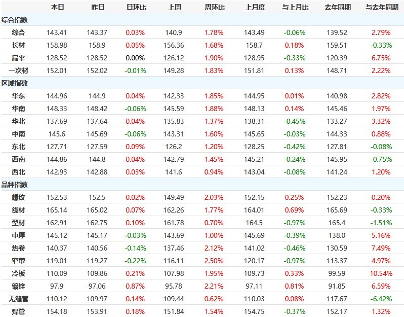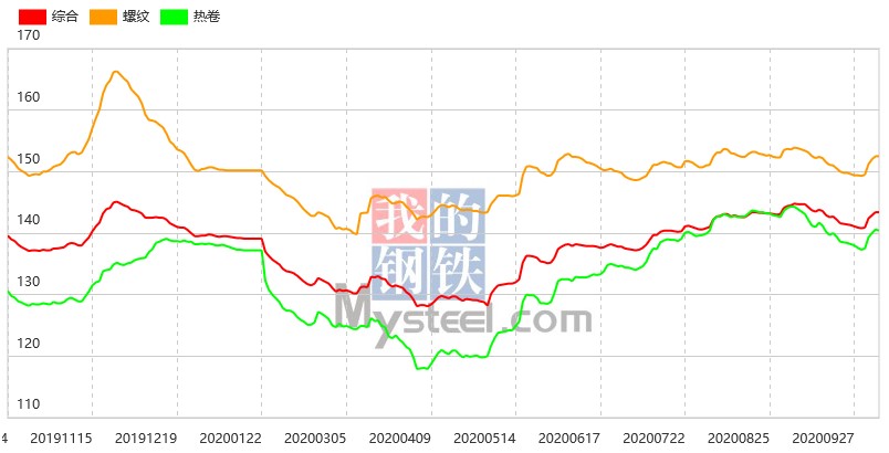 10月13日,国内钢材指数(Myspic)综合指数报143.41(绝对价格指数4066),较上一交易日上涨0.03%。其中,螺纹钢(3628, -9.00, -0.25%)指数报152.53(绝对价格指数3855),较上一交易日上涨0.02%。热卷(3784, -4.00, -0.11%)指数报140.37(绝对价格指数3936),较上一交易日下跌0.14%。