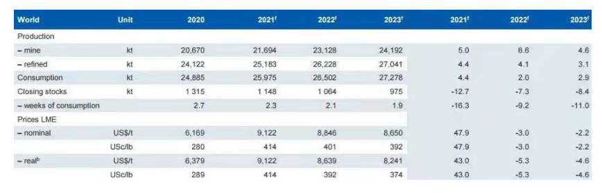 OCE预计,2021年LME铜名义价格均价为9,122美元/吨,较2020年的6,169美元/吨增长47.9%。2022和2023年料分别为8,846和8,650美元/吨。