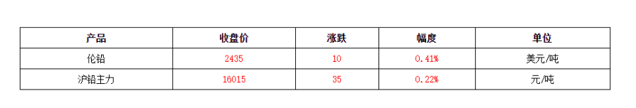 隔夜内外铅价上涨,伦铅再创新高,沪铅主力合约站到16000元/吨关口上方震荡,价格变动统计如表所示:
