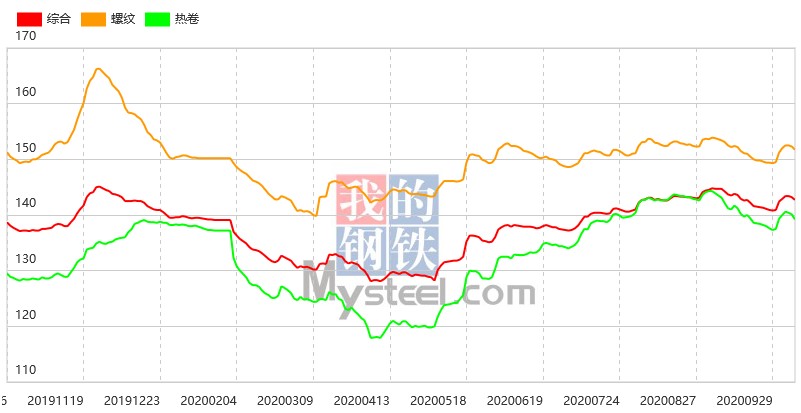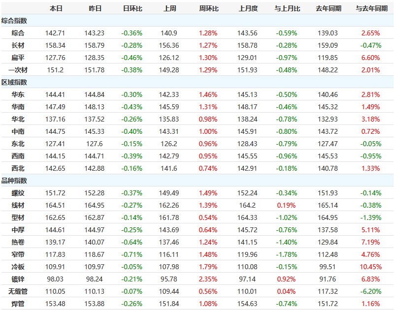 10月15日,国内钢材指数(Myspic)综合指数报142.71(绝对价格指数4046),较上一交易日下跌0.36%。其中,螺纹钢(3612, -10.00, -0.28%)指数报151.72(绝对价格指数3835),较上一交易日下跌0.37%。热卷(3725, -46.00, -1.22%)指数报139.17(绝对价格指数3902),较上一交易日下跌0.64%。