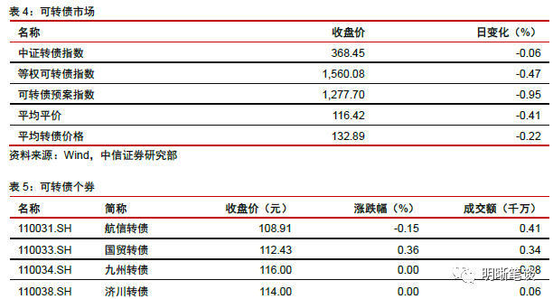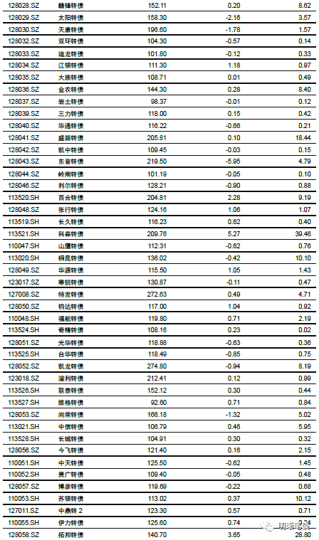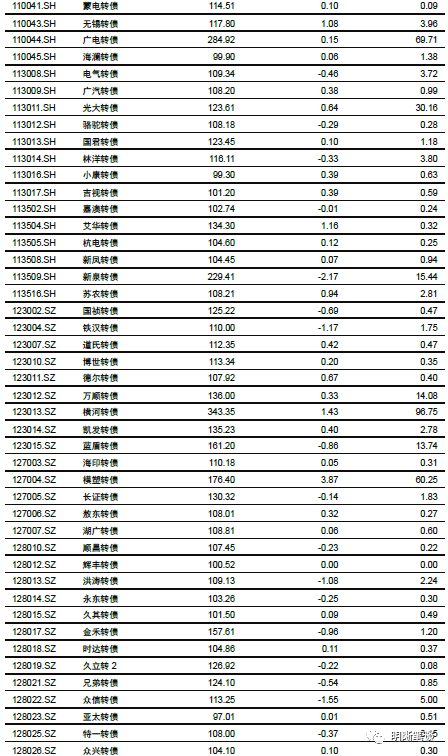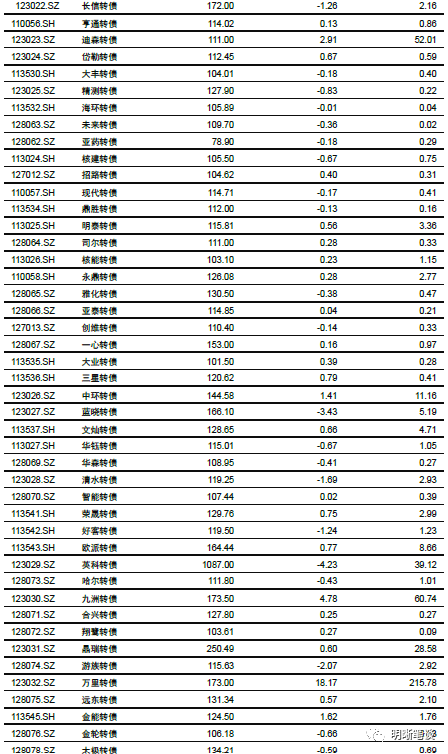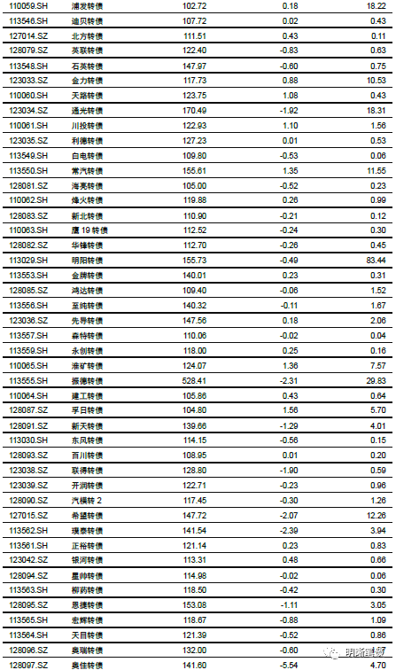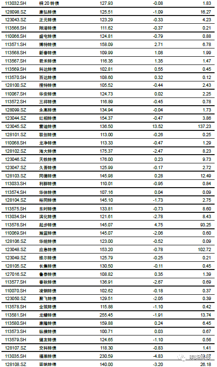 10月15日转债市场,中证转债指数收于368.45点,日下降0.06%,等权可转债指数收于1,560.08点,日下降0.47%,可转债预案指数收于1,277.70点,日下降0.95%;平均平价为116.42元,日下降0.41%,平均转债价格为132.89元,日下降0.22%。302支上市可交易转债(辉丰转债除外),除佳力转债(106.690, -0.57, -0.53%)、济川转债(114.780, 0.78, 0.68%)和九州转债(115.800, -0.20, -0.17%)横盘外,140支上涨,159支下跌。其中赛意转债(122.150, 1.15, 0.95%)(21.00%)、万里转债(198.971, 25.97, 15.01%)(18.17%)和雷迪转债(135.201, -1.30, -0.95%)(13.52%)领涨,东音转债(-5.95%)、奥佳转债(138.500, -3.10, -2.19%)(-5.54%)和福莱转债(231.170, 0.58, 0.25%)(-4.83%)领跌。298支可转债正股(*ST辉丰(3.620, -0.02, -0.55%)(维权)除外),除龙净环保(9.610, -0.07, -0.72%)、永高股份(8.410, 0.11, 1.33%)、荣晟环保(14.680, -0.38, -2.52%)、创维数字(9.800, -0.19, -1.90%)、司尔特(5.740, -0.07, -1.20%)、新凤鸣(11.040, -0.07, -0.63%)、杭电股份(5.690, 0.00, 0.00%)和厦门国贸(6.870, -0.03, -0.43%)横盘外,107支上涨,183支下跌。其中万里马(14.080, 1.67, 13.46%)(20.02%)、雷迪克(27.740, -1.32, -4.54%)(19.84%)和迪森股份(8.960, 1.49, 19.95%)(11.83%)领涨,嘉友国际(25.540, -0.74, -2.82%)(-10.00%)、航新科技(24.360, 0.12, 0.50%)(-8.87%)和游族网络(16.100, -0.45, -2.72%)(-7.80%)领跌。