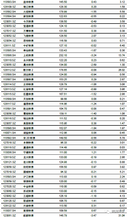 稳健弹性组合建议关注裕同转债(142.401, -2.70, -1.86%)、新泉转债(226.000, -3.41, -1.49%)、盛屯(中矿)转债、瀚蓝(维尔)转债、福莱转债、桐昆转债(134.400, -1.62, -1.19%)、康弘转债、太阳转债(157.700, -0.60, -0.38%)、拓邦转债(140.000, -0.69, -0.49%)、先导转债(142.800, -4.76, -3.23%)。