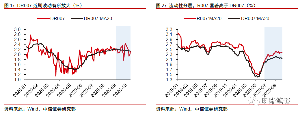 但是,银行间“水位”过低可能会导致资金面波动增大和流动性分层。首先,银行的低超储率容易引起资金面的波动增加。观察DR007及其20日均值的关系可以发现,尽管DR007的移动均值持续运行在相应的政策利率2.2%附近或以下,但每日的DR007却在9月放大了波幅。其次,银行间资金面的不稳定,也会导致一定的流动性分层——近几个月DR007和R007出现了比较明显的分化。