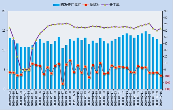 截至10月16日,山东地区125条(含9条连轧机组)开工率69.29%,较上周(10月09日)增长2.96个百分点。临沂地区65条生产线(含1条连轧机组)开工率63.08%,较上周增长3.08个百分点。总库存11.6万吨,较上周减少1.2万吨,周环比下降9.38%。