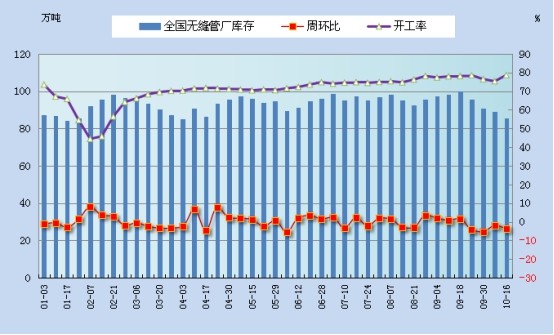 据兰格钢铁对样本企业调研无缝管生产情况,截至10月16日:全国200条(含长流程钢管厂40条)生产线开工率78.6%,较上周(10月09日)增长3.3个百分点。总库存85.7万吨,较上周减少3.2万吨,周环比下降3.6%。连续四周库存减少。