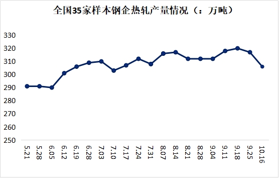 钢厂产量小幅回落:本周35家样本钢企热卷产量306万吨,比上周减少11万吨。