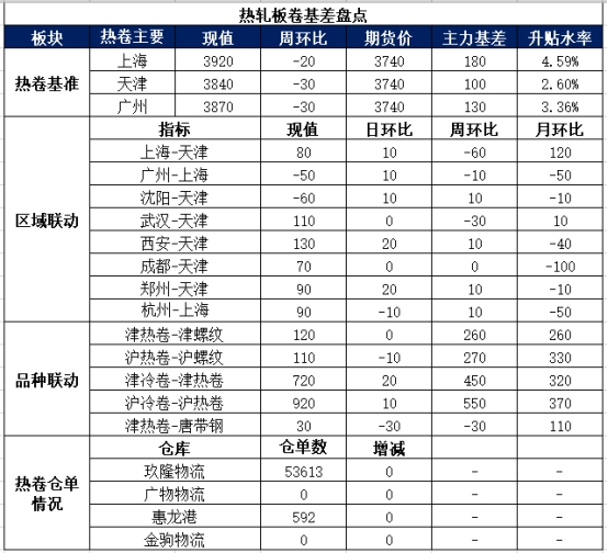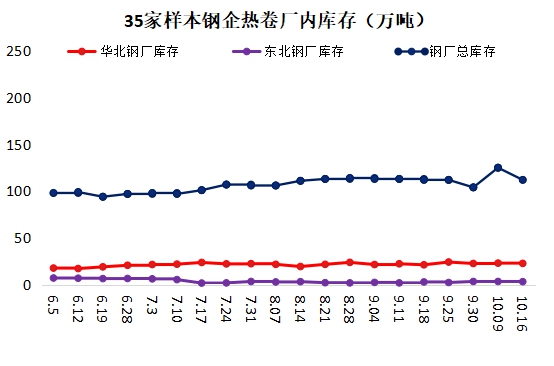 钢厂库存较上周持平:目前全国35家钢企热卷厂内库存112万吨,与上周持平。其中华北4家钢企热卷厂库22.8万吨,周减1.65万吨;东北4家钢企热卷厂库3.3万吨,周减0.2万吨。