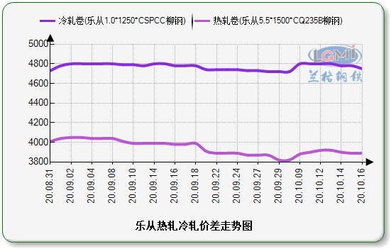 乐从地区:本周冷板市场价格下跌运行。节后首日期货走势良好,现货价格偏强运行。中后期随着期卷大幅下跌,商家情绪偏低,现货价格跟跌。宝钢、鞍钢出台11月份订货价格政策,冷轧板卷基价不变,仍然处于高位,商家订货方面谨慎为主。目前乐从市场薄料规格资源较少,报价相对较高,但无实际成交,且市场热冷价差仍处于高位,冷轧板卷价格后期恐支撑力不足。