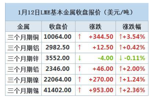 据外电1月12日消息,伦敦金属交易所(LME)期镍价格周三创逾10年新高,铜价突破每吨1万美元,因库存减少,供应担忧重燃。