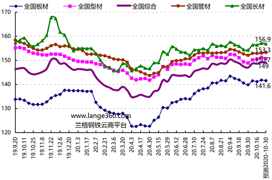 据兰格钢铁云商平台周价格预测模型数据测算,下周(2020.10.26-10.30)国内钢材市场价格将震荡下滑,长材市场价格将稳中下滑,型材市场价格将小幅下跌,板材市场价格震荡下滑,管材市场价格将稳中上涨。兰格钢铁全国钢材综合价格指数预计在149.0点附近波动,钢材均价在4090元左右,平均波动10-50元左右;其中,长材价格指数预计在156.9点附近波动,下滑0.2点;型材价格指数预计在150.7点附近波动,下跌0.5点;板材价格指数预计在141.6点附近波动,下滑0.2点;管材价格指数预计在153.3点附近波动,上涨0.3点。