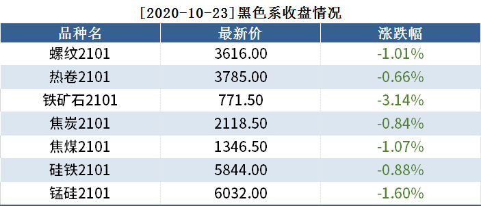 截至10月23日收盘,螺纹2101收3616,跌1.01%;热卷(3785, -25.00, -0.66%)2101收3785,跌0.66%;铁矿(772, -25.00, -3.14%)石2101收711.5,跌3.14%。各品种具体如下: