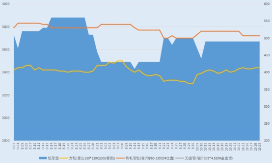 今日(10.29),唐山地区方坯(150*150 Q235普碳)出厂价为3440元,与上个交易日持平。临沂江鑫20#热轧管坯出厂价格3720元,与上个交易日持平。临沂金宝诚管厂108*4.5mm出厂价格4250元,坯管差490元。
