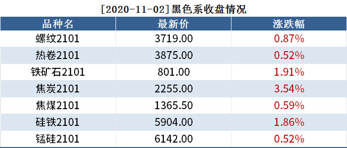 截至11月2日收盘,螺纹2101收3719,涨0.87%;热卷(3875, 20.00, 0.52%)2101收3785,涨0.52%;铁矿(801, 15.00, 1.91%)石2101收801,涨1.91%。各品种具体如下: