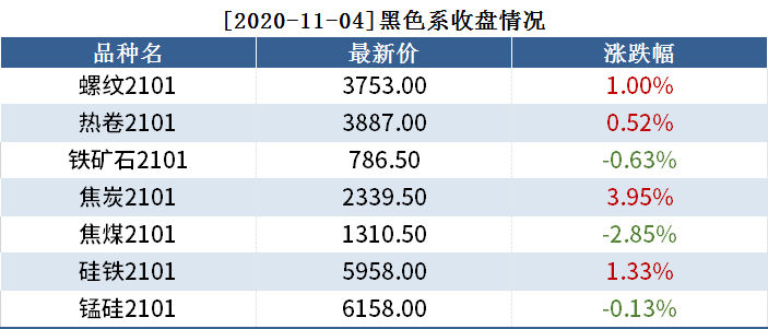 截至11月4日收盘,螺纹2101收3753,涨1.00%;热卷(3887, 20.00, 0.52%)2101收3887,涨0.52%;铁矿(787, -5.00, -0.63%)石2101收786.5,跌0.63%。各品种具体如下: