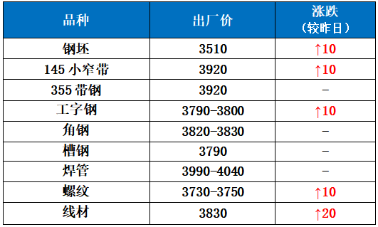 带钢:11月6日唐山首唐宝生等主流钢厂小窄带出厂价稳,盘中涨10元/吨,基本出清日产,截至发稿报3920元/吨。355系维稳,唐山瑞丰报3920元/吨。
