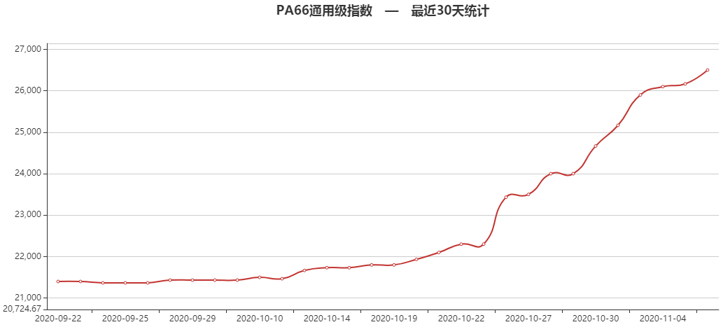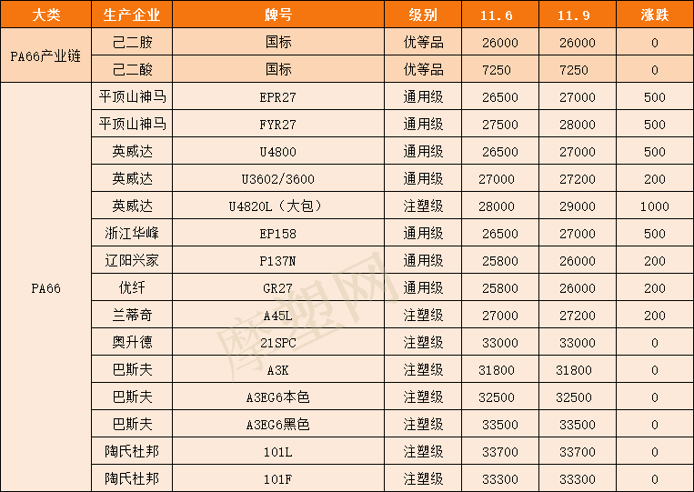 摩塑网交易平台成交情况,PA66市场价格主要表现为继续冲高。市场中聚合工厂与持货商报价继续走高;场内货源不足,PA66市场整体维持上行;平台上产品价格随市场变化。根据摩塑网平台成交数据显示,预计今日PA66市场价格应会是坚挺向上!
