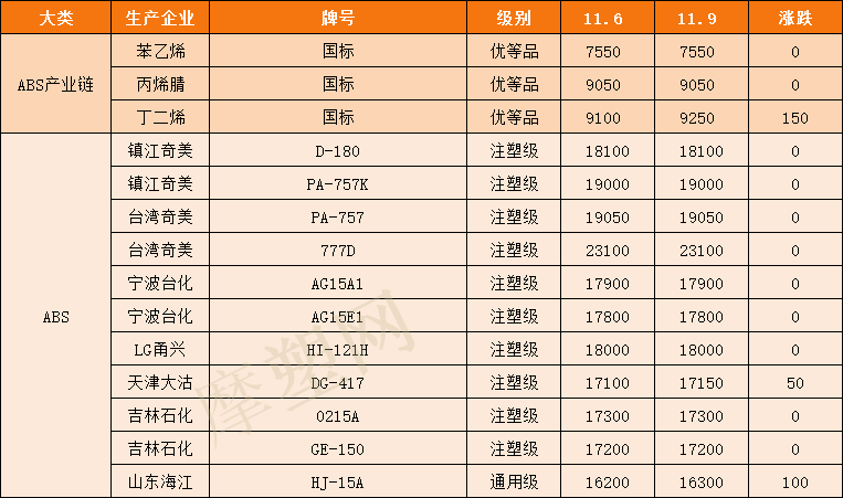 摩塑网交易平台成交情况,ABS市场价格主要表现为稳中小涨。市场中厂家报价个别上调;原料苯乙烯价格走高,受货紧成本等利好支撑,ABS价格稳中向好;平台上产品价格随市场变化。根据摩塑网平台成交数据显示,预计ABS今日市场价格应会是小幅上涨!