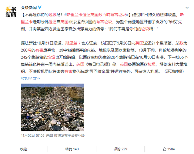 斯里兰卡因垃圾这件事和英国battle了好久,两方都在拼命争取自己的权益。一方不愿意接受,一方不想收回。最终经过旷日持久的较量,斯里兰卡battle赢了。毕竟把自己的垃圾扔到别人的国家,于情于理都说不过去,还有点过分。